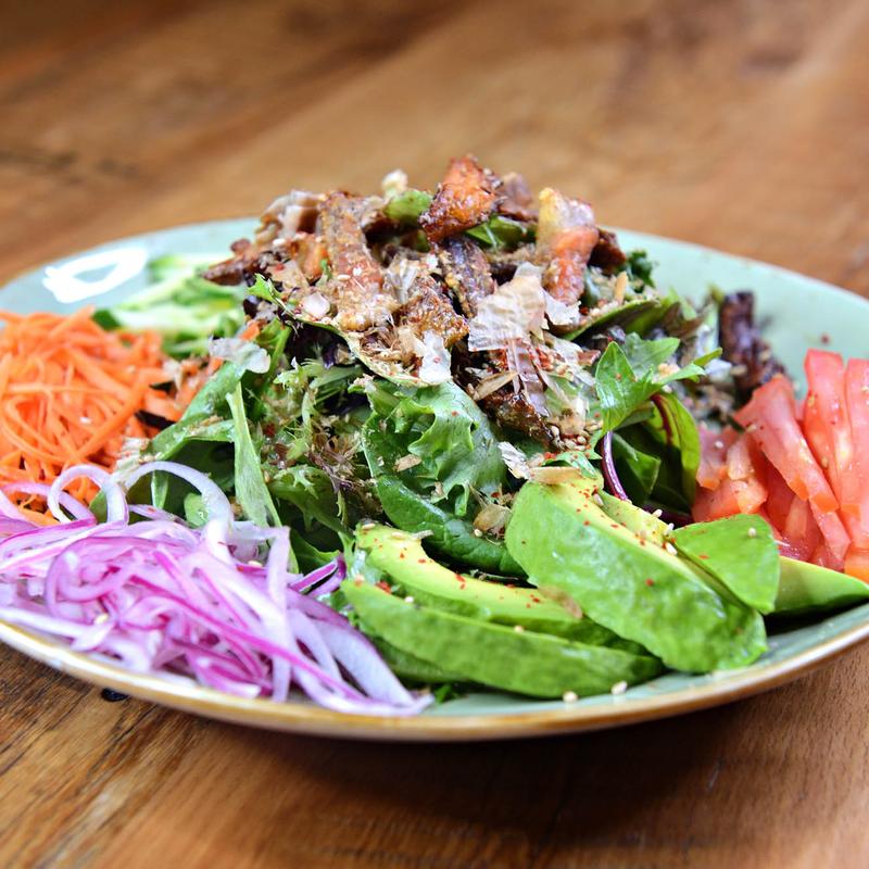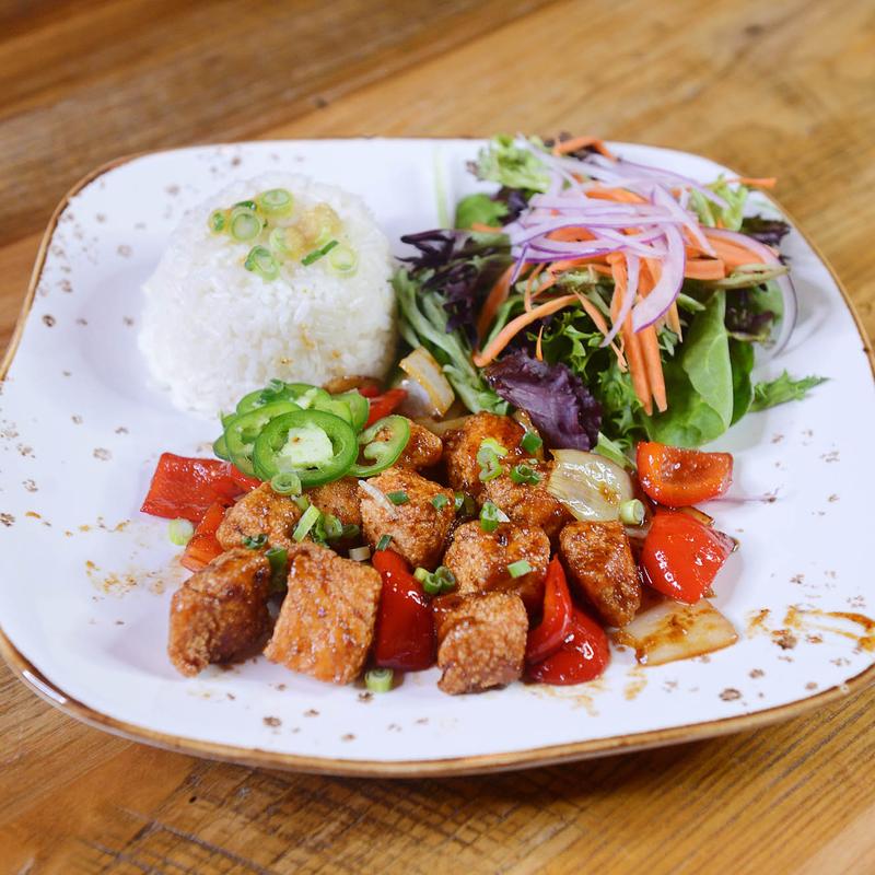 Omg delicious food and vibes. To start we had the Philly steak egg rolls and truffle fries. For dinner I got the dynamite salmon fried rice and a ginger ale. All so good! We ate outside by the fire and it was so relaxing. The interior is earthy but also artsy.